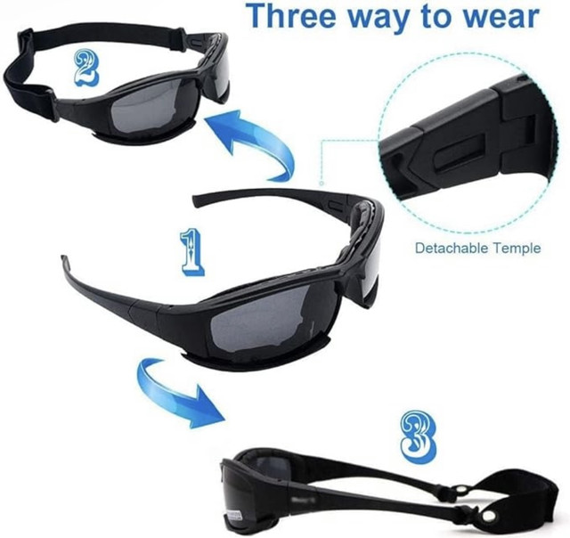 ✔ 4 змінні лінзи. Чорні поляризаційні лінзи підходять для носіння на сонці. Жовті лінзи нічного бачення підходять для носіння вночі або в темряві. Прозорі лінзи підходять для носіння в дощовиті дні або за поганої видимості. Коричневий UVA/UVB підходить для носіння на сонці.